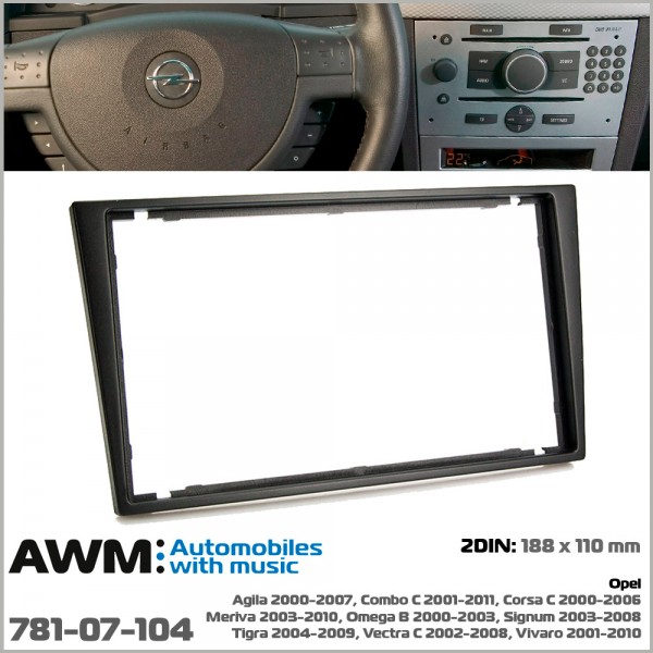 Рамка перехідна AWM 781-07-104 Opel – це модельна деталь від відомого виробника. Призначена перехідна рамка для встановлення магнітоли формату 2DIN в автомобіль, що спочатку обладнаний заводською магнітолою. Подібні роботи затребувані сьогодні оскільки такий тюнінг значно розширює можливості головного пристрою - екран більшого розміру дає можливість перегляду зображення з камери заднього виду або з флешки, андроїд магнітоли дозволяють вийти в інтернет і користуватися навігацією. В цілому сенсорний екран 2ДИН магнітофона набагато звичніше і зручніше у використанні. Сама рамка допомагає закрити зайві щілини та отвори під час встановлення, як результат, ми маємо заводський зовнішній вигляд після завершення монтажу. Рамка виготовлена з якісного ABSпластику чорного кольору, який повторює текстуру рідного покриття. Завдяки 3D дизайну, рамка надійно кріпиться до торпедо і повторює в точності її форму. Основні характеристики AWM 781-07-104 Opel: