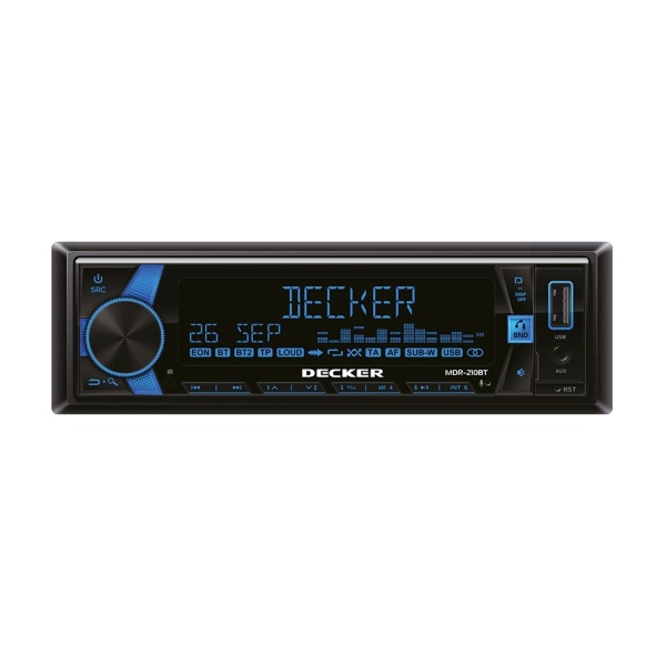 <p style="text-align: justify;">Автомагнітола Decker MDR-210 - 1Din MP3 програвач з FM приймачем, DSP процесором та вбудованим підсилювачем D класу. Пристрій має 4 канальний підсилювач потужністю 95Вт на канал, а також 6 лінійних виходів для підключення додадткових зовнішніх підсилювачей. Обробку звуку здійснюється через DSP процесор. Для налаштування параметрів звуку та дистанційного керування встановіть в телефон додаток Decker Audio.</p>