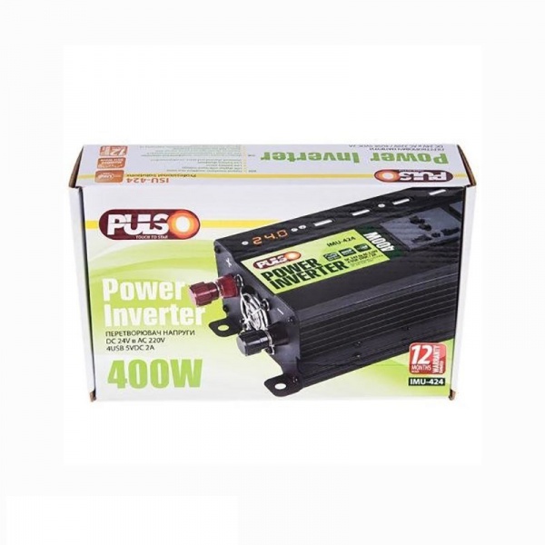 Інвертор 24V-220V PULSO IMU 424 - чудовий вибір для вашого автомобіля. Це надійний комплект від відомого виробника, який призначений для автомобілів з живленням в мережі 24 В і здатний на виході передати напругу домашньої мережі 220 В. Це часто буває необхідно для використання в автомобілі побутових приладів, до яких ми звикли, таких як ноутбук, чайник, вентилятор, зарядний пристрій та багато інших пристроїв, аналогів яким немає в машині. Інвертор має компактний розмір, не вимагає тривалого монтажу, користуватися ним легко зможе будь-яка людина. Завдяки цьому подібний пристрій широко затребуваний серед власників, в першу чергу, вантажної та спеціальної техніки. >Тип - інвертор