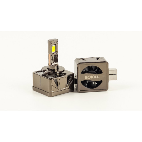 Комплект автомобільних світлодіодних LED ламп Sokill De D1, 2 шт. – відмінний вибір для вашого автомобіля. Це надійна лампа, яка допоможе вирішити проблему поганої видимості на дорозі вночі. Технологія LED набагато сучасніша за галогенову, постійно розвивається, на ринку з'являються нові моделі якісних авто ламп. Лед лампа світить яскравіше, світловий потік потужніший, можна вибрати відтінок світла. При правильному встановленні лампи на виході отримуємо потужне і яскраве світло на ближньому і широке, збільшене дальнє. Одна з найкращих LED ламп, коли водій отримує максимум світла – ця модель. Перевірена часом конструкція, габарити лампи, відповідність формі стандартної галогенової лампи, правильне розташування діода – це гарантує, що світловий потік буде спрямований правильно, у потрібному напрямку, забезпечуючи відмінну освітленість у місті чи на трасі. Колірна температура 6000 К дає відмінний баланс, що дозволить добре пробивати неосвітлену дорогу вночі. Активна система охолодження з вентилятором гарантує тривалий термін роботи