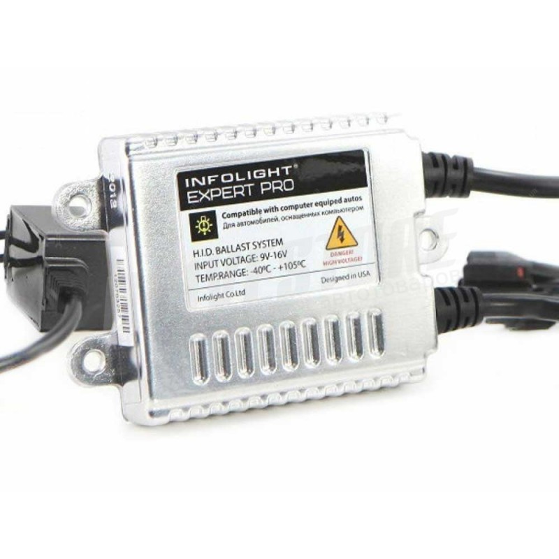 Ксенон Infolight комплектується лампами, які чудово зарекомендували себе в складних українських умовах, мають високу стійкість до роботи при сильних перепадах температури, сильній трясці та вібраціям, що неминуче навіть за умов міста, не кажучи вже про заміську поїздку. Блок розпалювання Infolight Expert 35Вт, це універсальний компонент для ксенонових ламп, який підходить до будь-якої марки легкових автомобілів з будь-яким типом діагностики ламп. Може бути чудовою альтернативою оригінальним ксеноновим баластам. Основна особливість таких блоків у тому, що перехід у режим стабілізації горіння дуги відбувається швидше, автоматичний перезапуск при зриві дуги, висока тепловіддача корпусу радіаторного типу та висока стійкість до вібрації та механічних навантажень. Принцип роботи цієї моделі, за системою AC, вона передбачає, що в установку вбудований стабілізатор постійного струму, який при нормальному режимі роботи усуває мерехтіння на лампах і продовжує її роботу. Роз'єм КЕТ, з прямокутним конектором, найчастіше зустрічаються на європейському ринку, а високовольтні дроти із силіконовим покриттям.