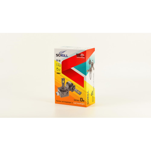 Комплект автомобільних світлодіодних LED ламп Sokill De D1, 2 шт. – відмінний вибір для вашого автомобіля. Це надійна лампа, яка допоможе вирішити проблему поганої видимості на дорозі вночі. Технологія LED набагато сучасніша за галогенову, постійно розвивається, на ринку з'являються нові моделі якісних авто ламп. Лед лампа світить яскравіше, світловий потік потужніший, можна вибрати відтінок світла. При правильному встановленні лампи на виході отримуємо потужне і яскраве світло на ближньому і широке, збільшене дальнє. Одна з найкращих LED ламп, коли водій отримує максимум світла – ця модель. Перевірена часом конструкція, габарити лампи, відповідність формі стандартної галогенової лампи, правильне розташування діода – це гарантує, що світловий потік буде спрямований правильно, у потрібному напрямку, забезпечуючи відмінну освітленість у місті чи на трасі. Колірна температура 6000 К дає відмінний баланс, що дозволить добре пробивати неосвітлену дорогу вночі. Активна система охолодження з вентилятором гарантує тривалий термін роботи