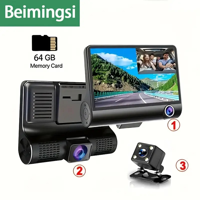 Відеореєстратор BEIMINGSI з 3 камерами, дві вбудовані: передня і внутрисалонна і 3-я виносна - задня, з вбудованою карткою пам'яті 64 ГБ. HD відеозапис, кнопковий контроль, сумісний зі смартфонами, матеріал ABS, акумулятор літій-полімерний